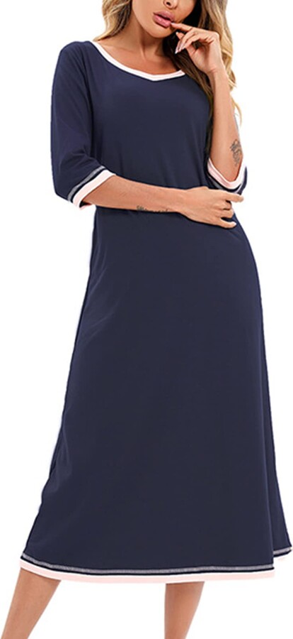 Alunsito Women S Long Nightgown Cotton V Neck Sleepwear Short Sleeve Loungewear Spring Summer Casual Loose Pajamas Sleep Dress S Dark Blue Shopstyle Nightdresses